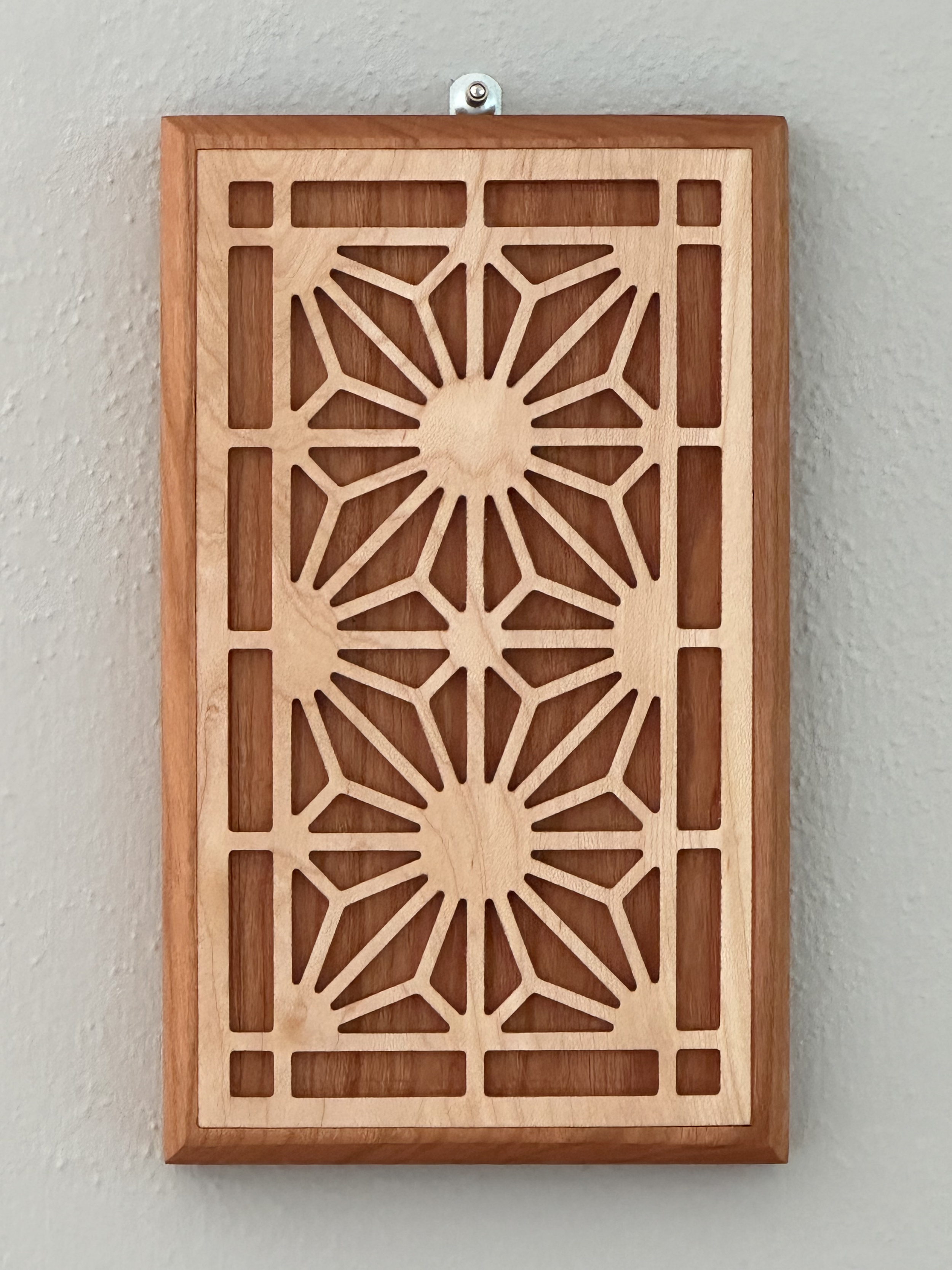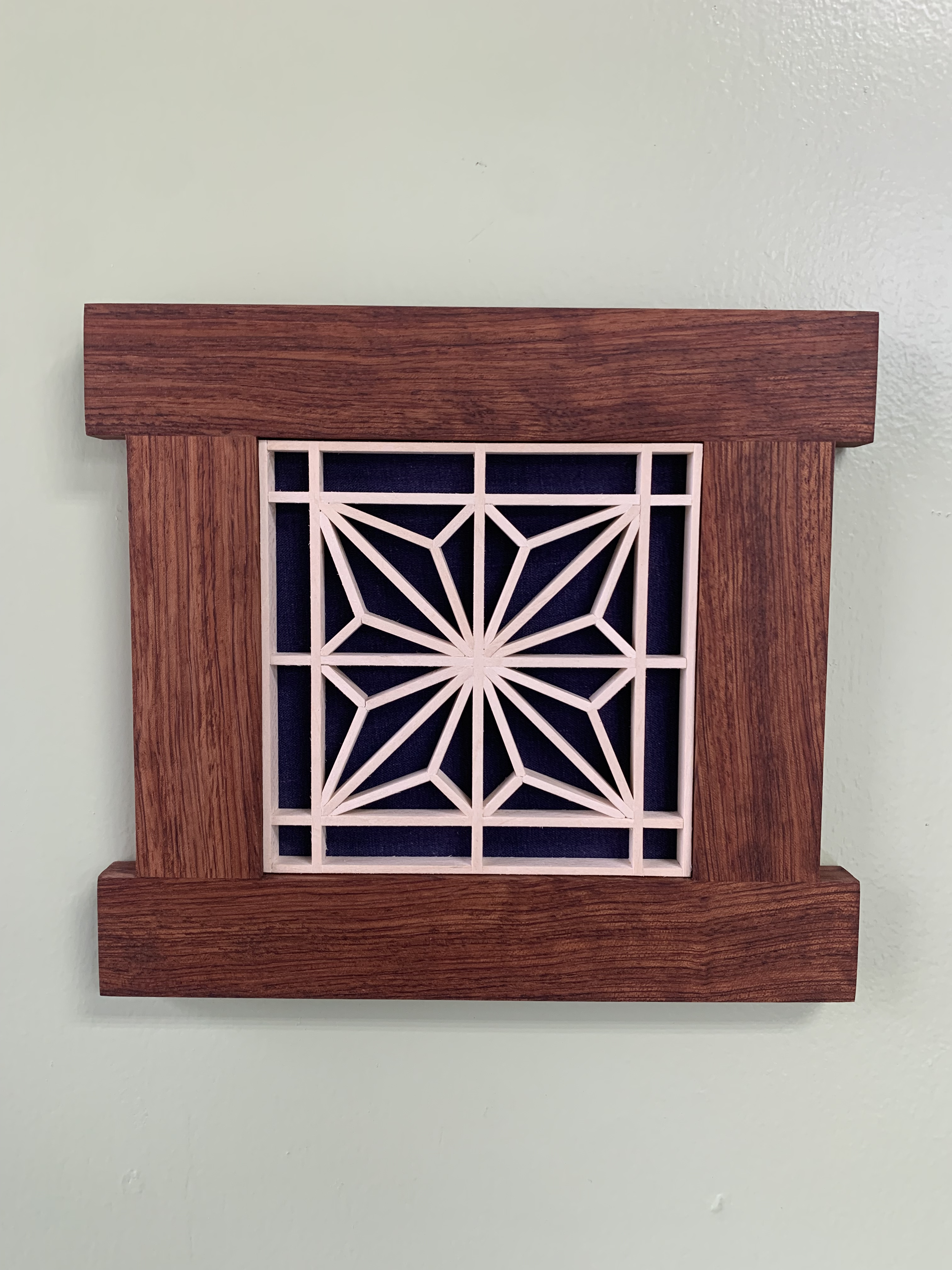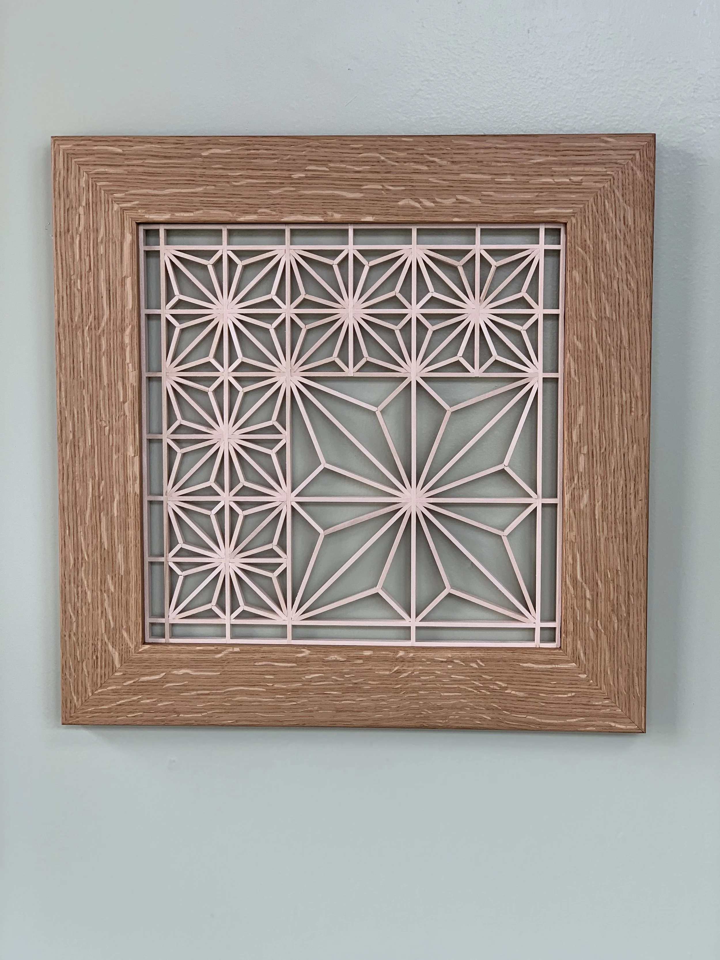 Kumiko panels slot together and remain in place without the use of nails or glue but through pressure alone. The maker uses meticulous chiseling, cutting, and arranging which results in a complex pattern of art that can stand alone like this piece or be incorporated into furniture or cabinetry.