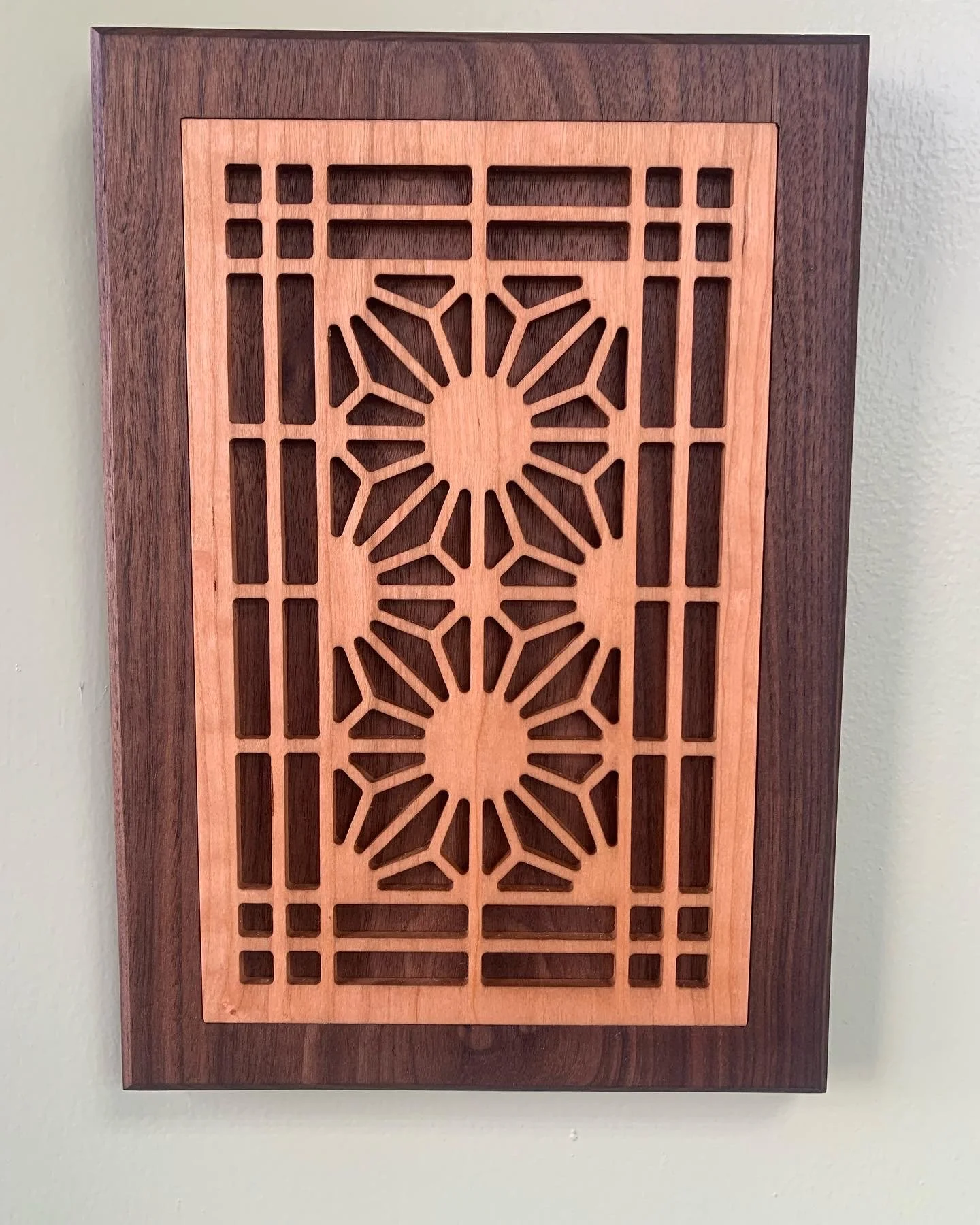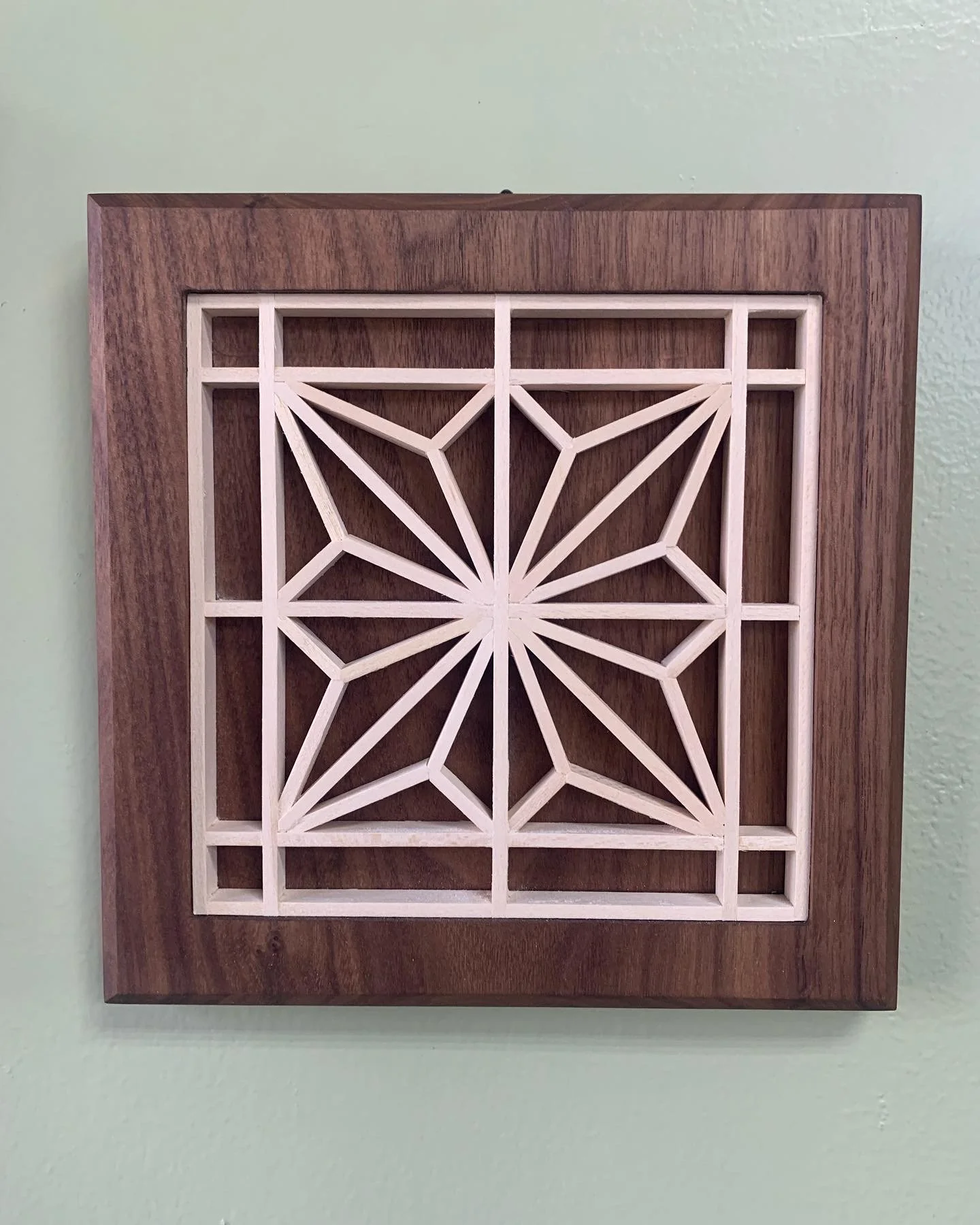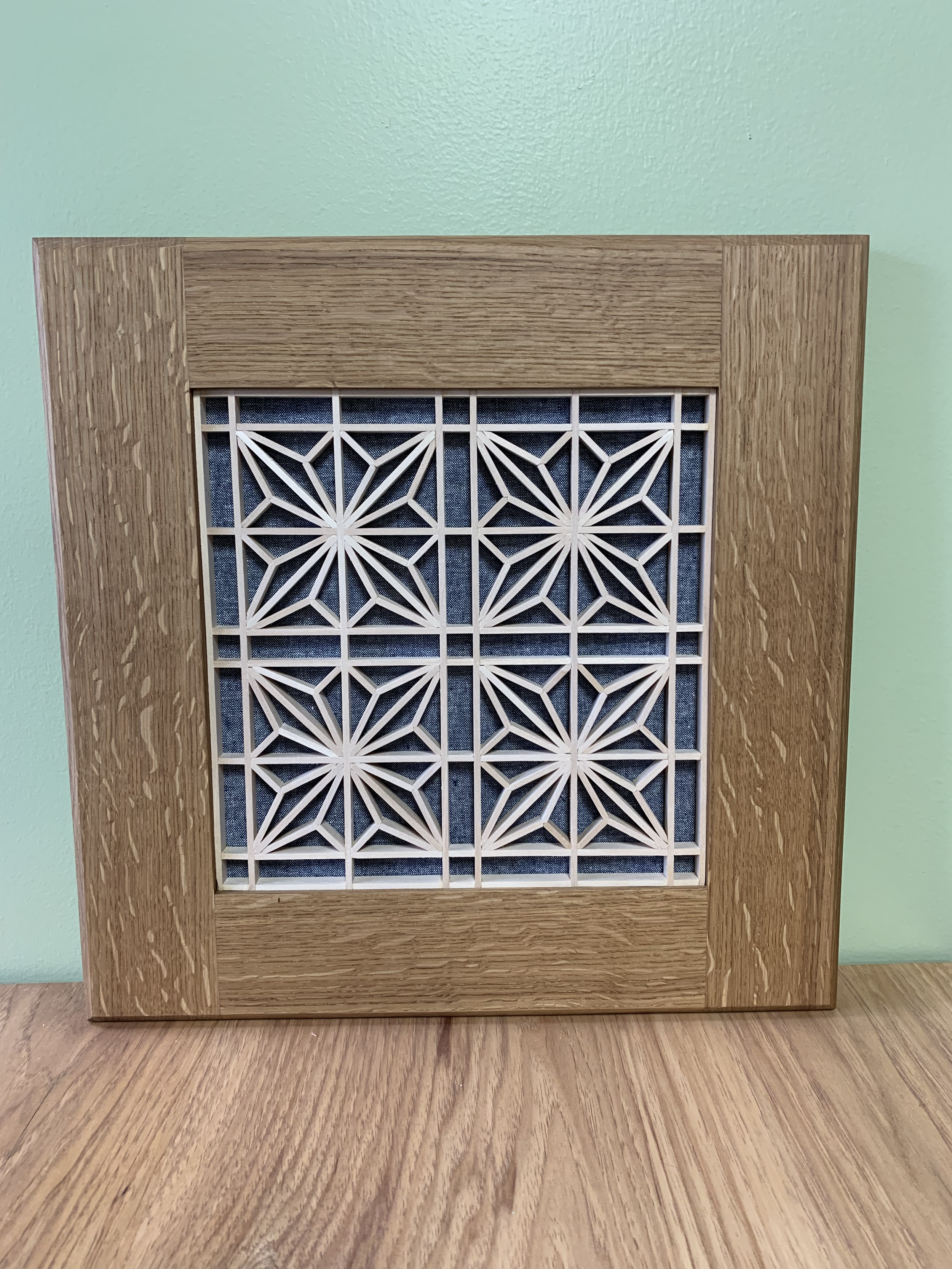 Kumiko panels slot together and remain in place without the use of nails or glue but through pressure alone. The maker uses meticulous chiseling, cutting, and arranging which results in a complex pattern of art that can stand alone like this piece or be incorporated into furniture or cabinetry.